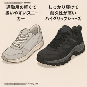 例えるなら「通勤用の軽くて扱いやすいスニーカー(sense10)」と「しっかり履けて長く使えるハイグリップシューズ(Galaxy A36)」の違いに近いイメージです。