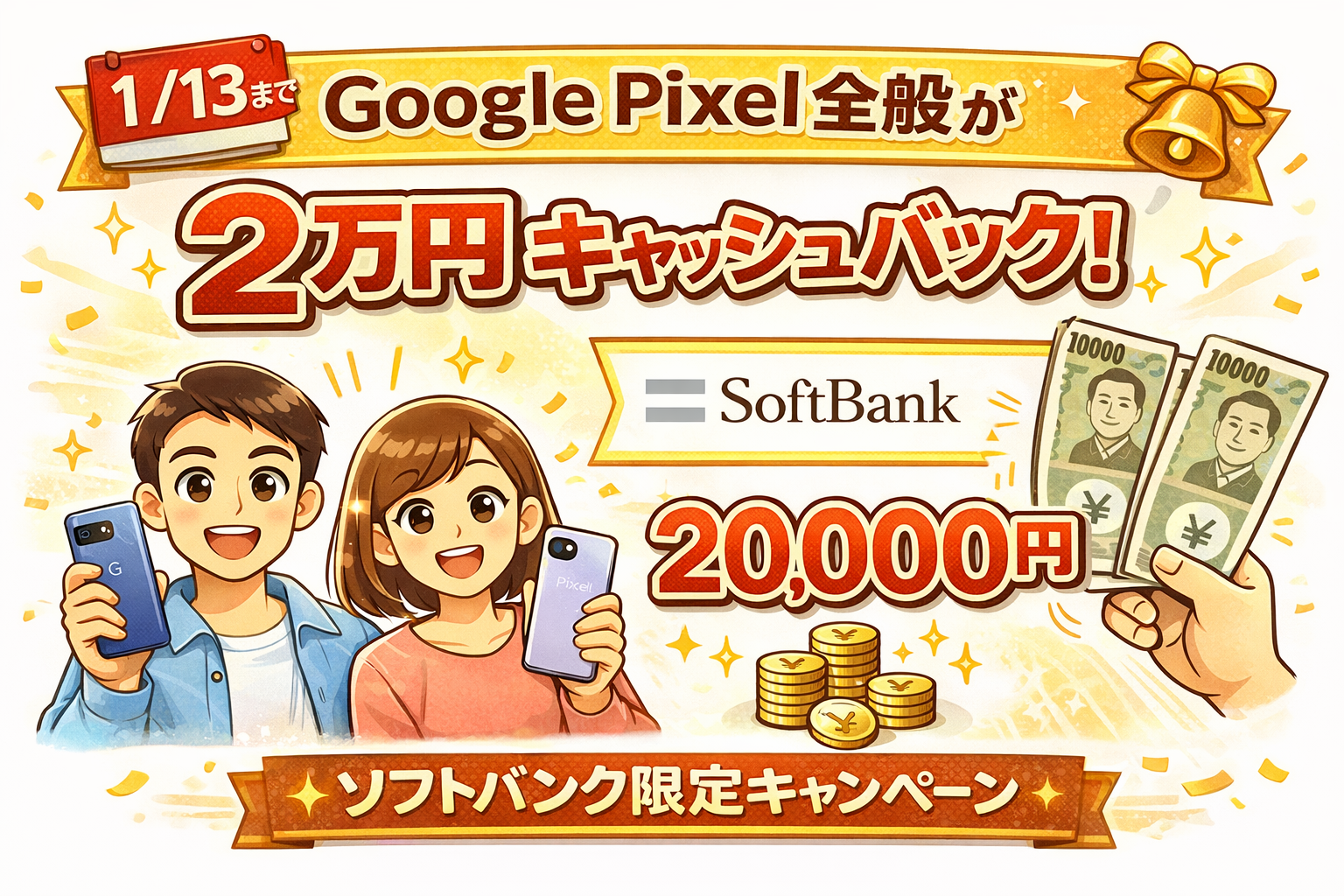 ソフトバンク限定で、Google Pixel系スマートフォンを対象とした現金キャッシュバックキャンペーンが実施されています。