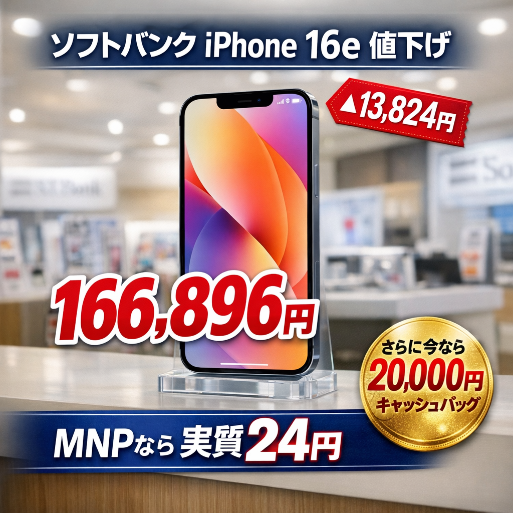 ソフトバンク iPhone 16e値下げ|512GBが166,896円に、MNP実質24円