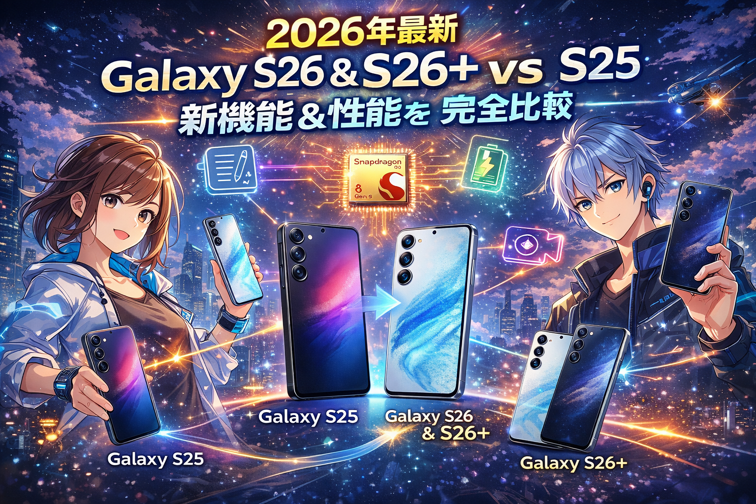 Galaxy S26 / S26+は、Galaxy S25から「処理性能・バッテリー・AI機能・動画性能」が着実に進化した最新フラグシップです。