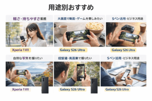 ただし、大画面で没入感を求めるならGalaxy S26 Ultra、軽さや発熱バランスを重視するならXperiaが向いています。