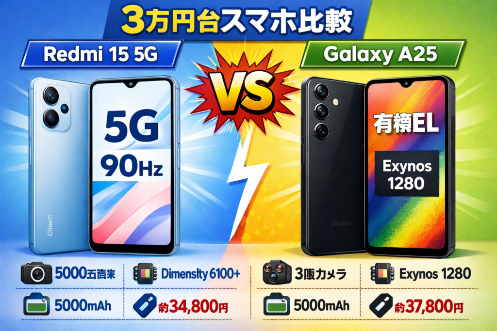 3万円台スマホ比較|Redmi 15 5G vs Galaxy A25